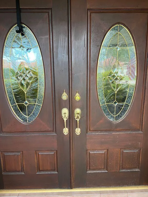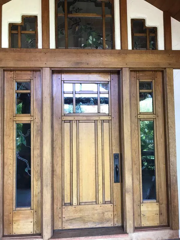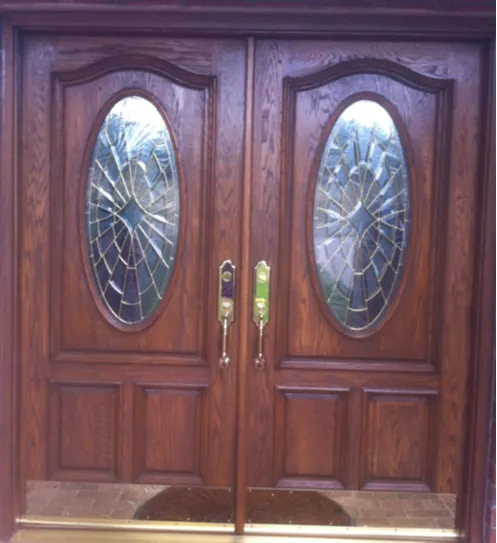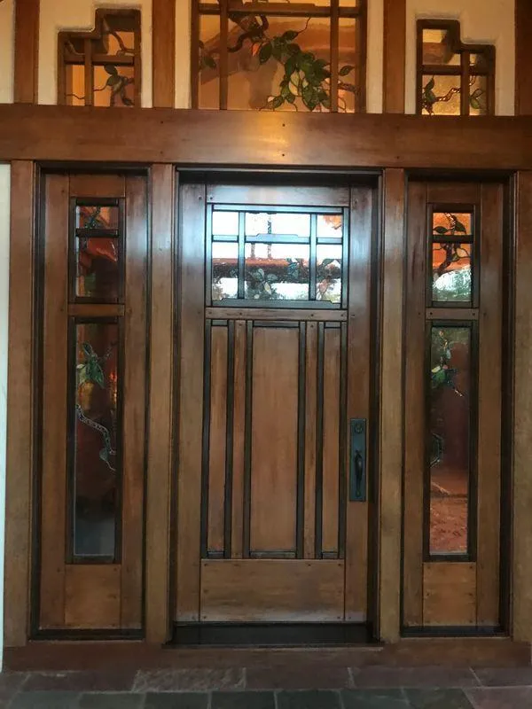 To add to its value the husband had personally created stained glass inserts that fit in the sidelight windows. This unique door set is now safe and protected with years to come with only an hour of so of maintenance by the homeowners each year.
