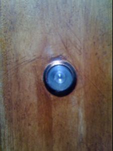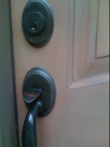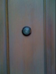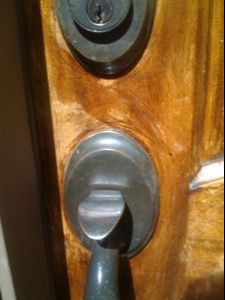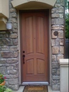 This door was refinished one year ago by a painter. Notice the sanding gouges around the handle and peep hole. They didn’t even remove the hardware. The door was sanded in place, without even being removed from the hinges. Notice the qualitative difference after we refinished this door. We created a custom grey-toned stain to match the surrounding stones.